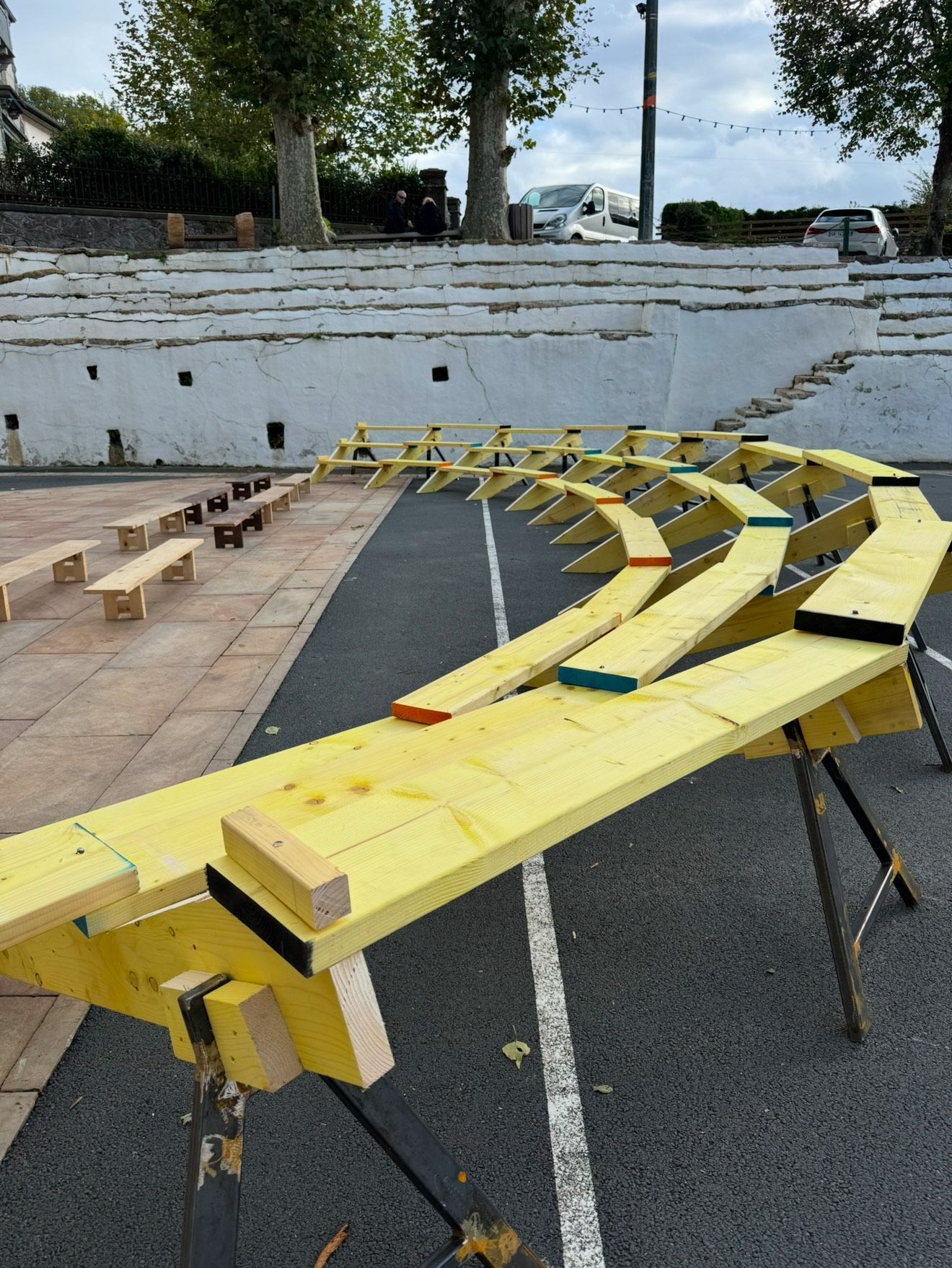 Nous avons fabriqué des petits gradins sur le modèle du Fourneau à Brest. On a augmenté la section du bois (45mm d'épaisseur au lieu de 30mm) et apporté quelques petits renforts (pour qu'ils vieillissent mieux...)